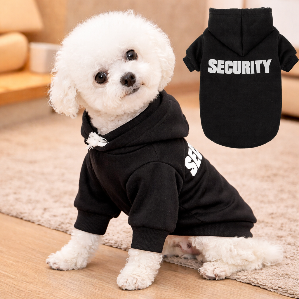 With bold white "SECURITY" lettering on the back and side, it's ideal for themed events, casual walks, or just keeping your dog snug on chilly days. The hoodie design adds extra coverage and flair, making your four-legged friend look both tough and adorable.